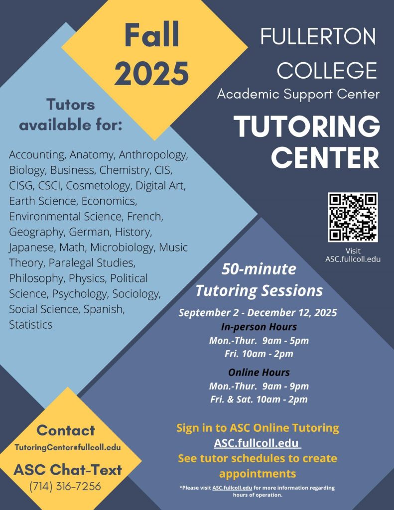 Our Fullerton College tutors from the Tutoring Center and Writing Center are offering tutoring online and in-person within the Academic Support Center on campus. Click on the Login to ASC Tutoring button below to access our online appointment system for tutoring.