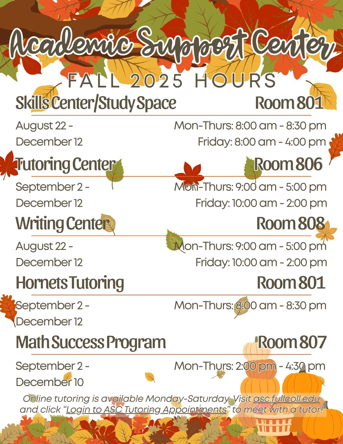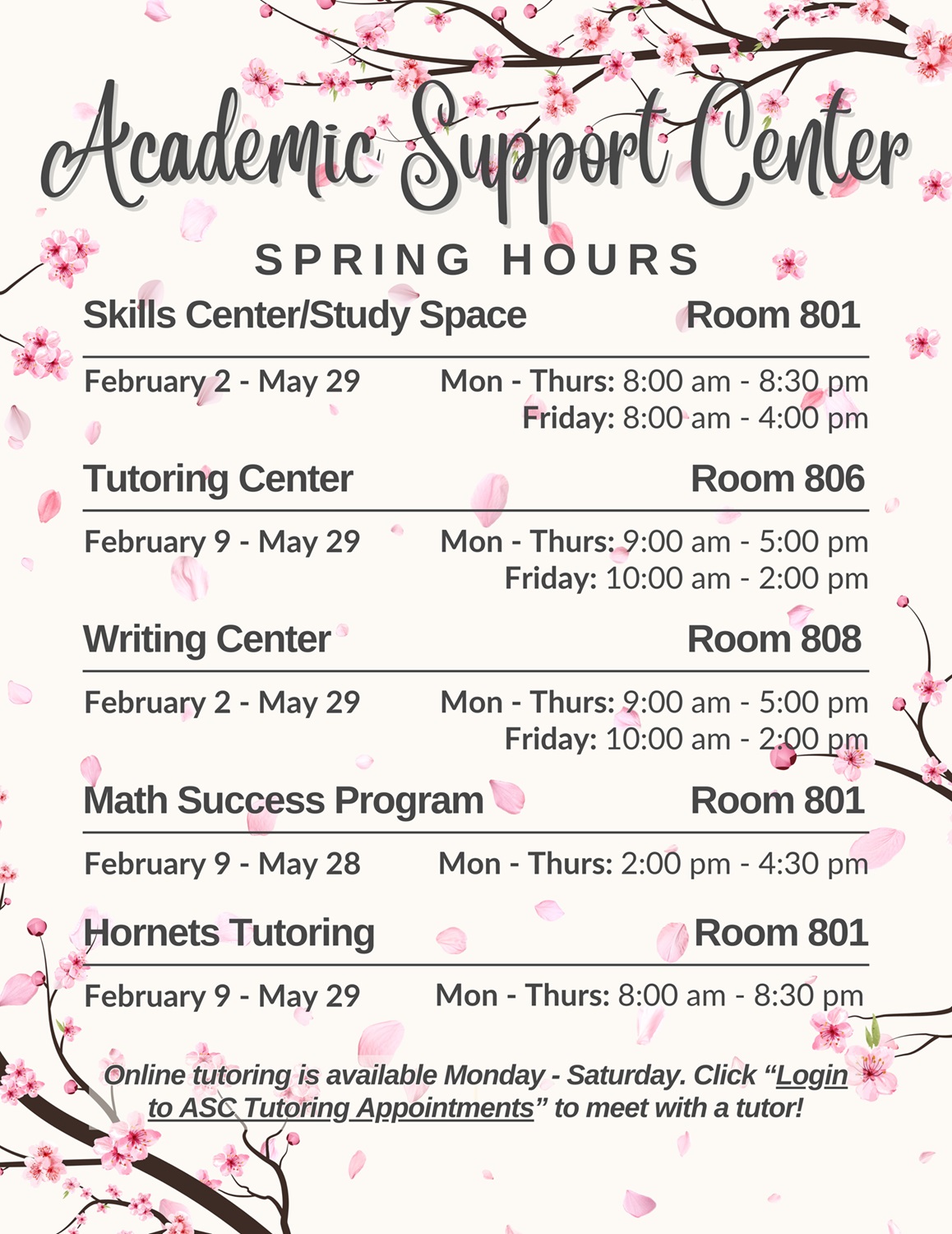 As a part of the Library/Learning Resources, Instructional Support Programs & Services Division, the Academic Support Center (ASC) provides instructional support services to students, faculty, and staff with the aim of helping students achieve academic success. The ASC is comprised of multiple related services: the Skills Center, the Tutoring Center, the Writing Center, Hornets Tutoring and the Math Success Program.