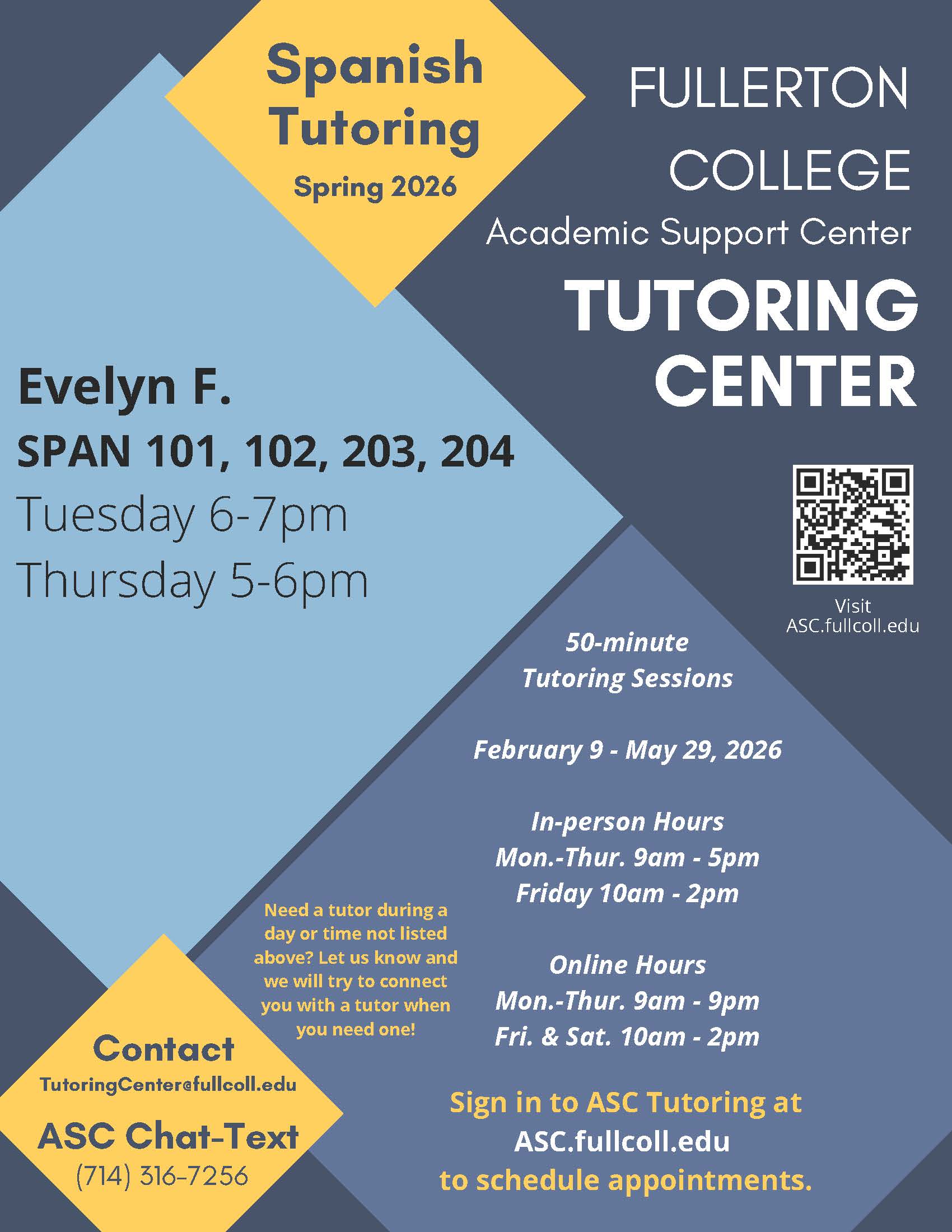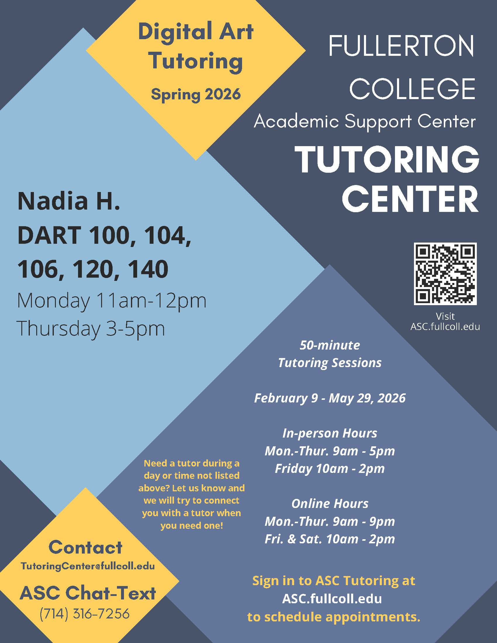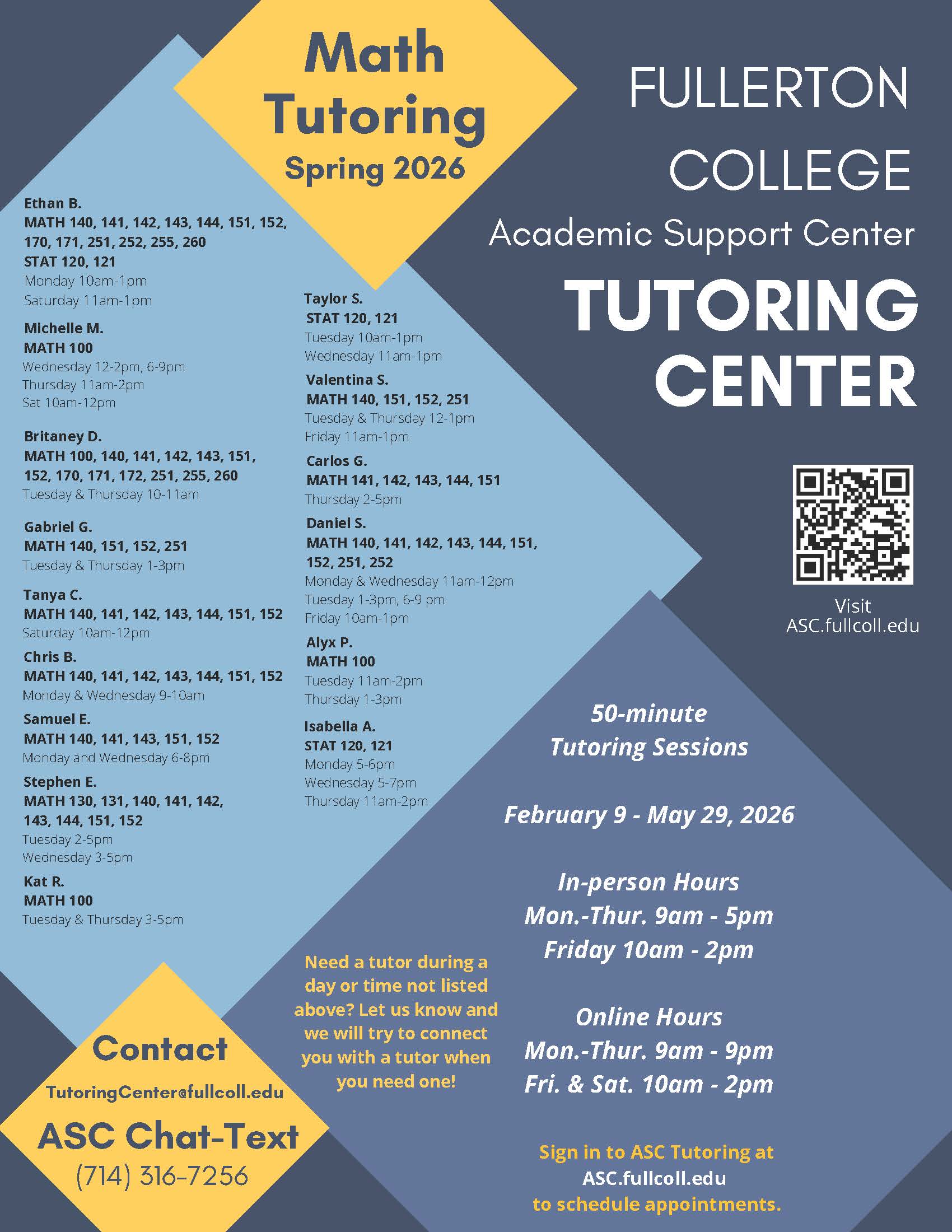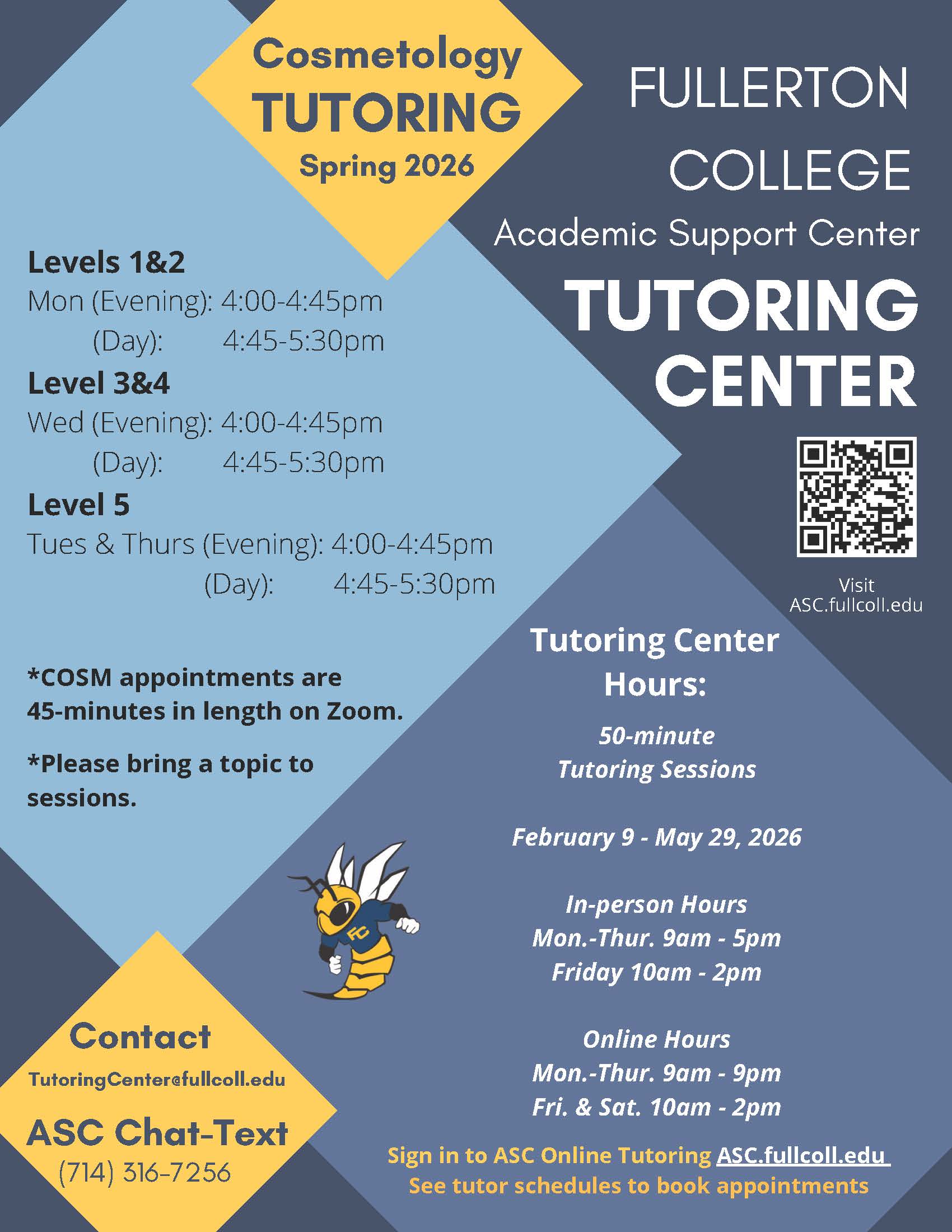 Academic Support Center ASC Hours ASC Staff Presentation Request Videos Jobs Contact Us Division Home Tutoring Center Tutoring Services Tutoring Flyers Cosmetology FAQ Writing Center Writing Center Services Online Writing Resources Writing Center Workshops FAQ English Department ESL Department Skills Center ESL Make-up Testing Workshops Math Success Program Hornets Tutoring Tutoring Center Flyers Check out the flyers for each subject here Spring 2026