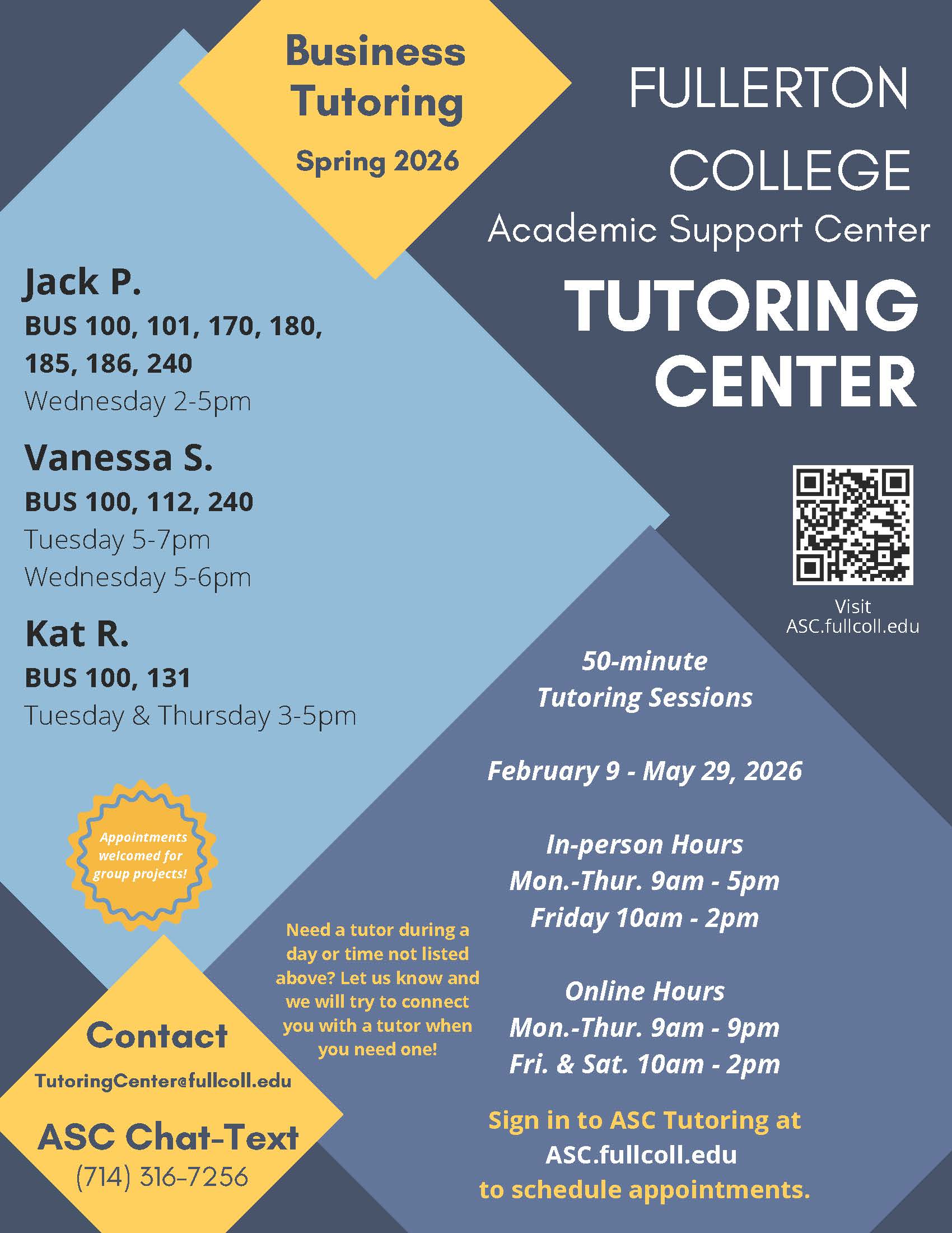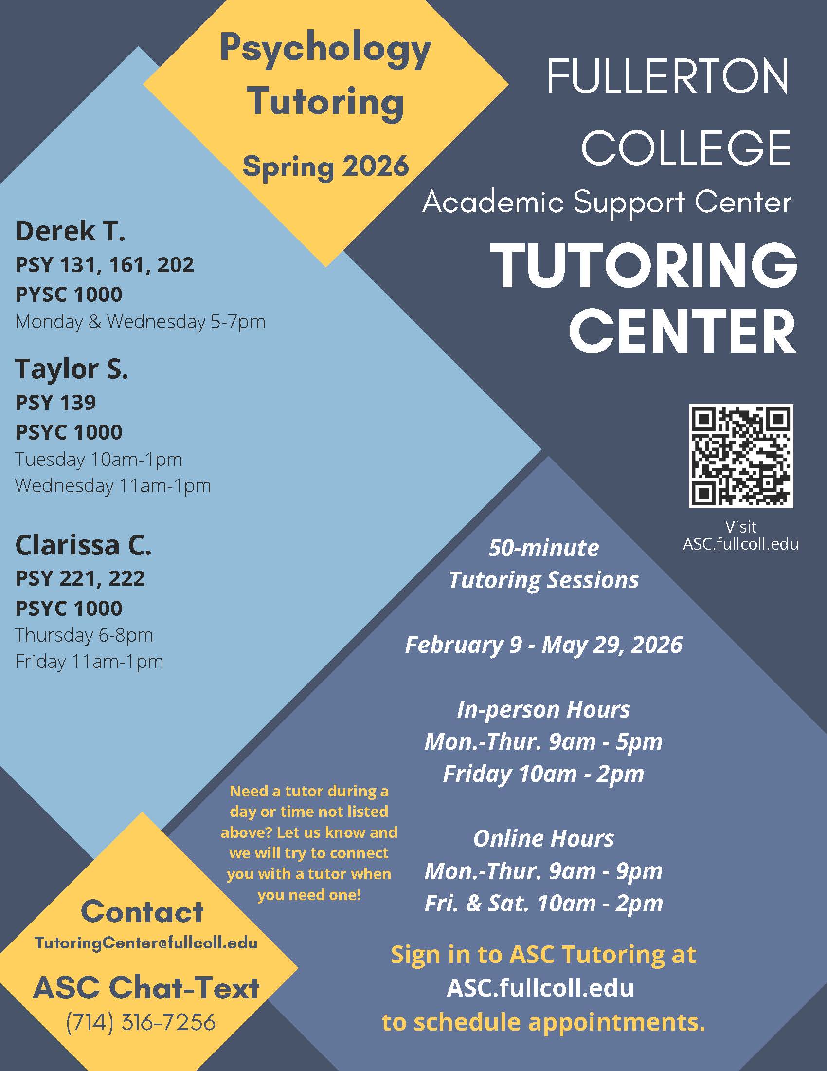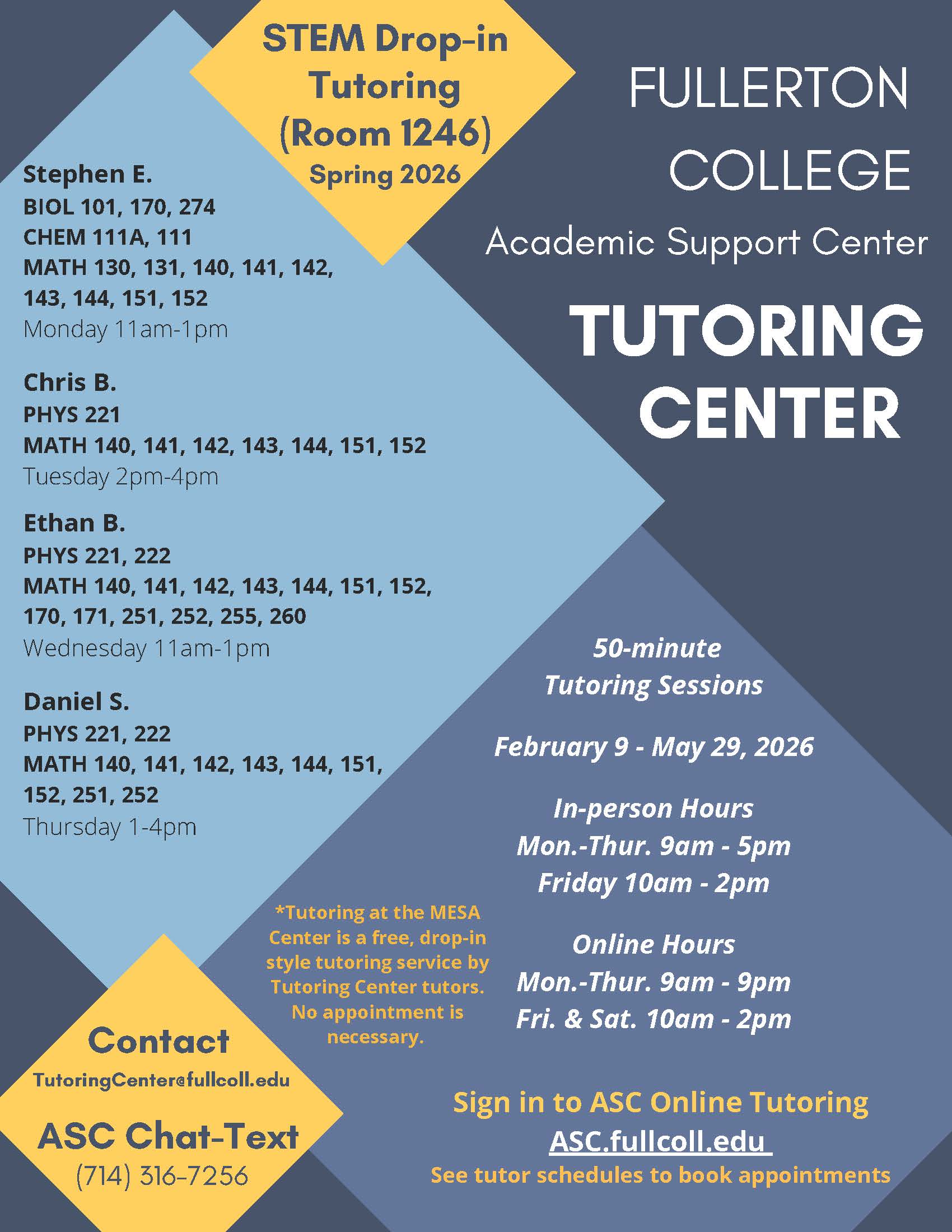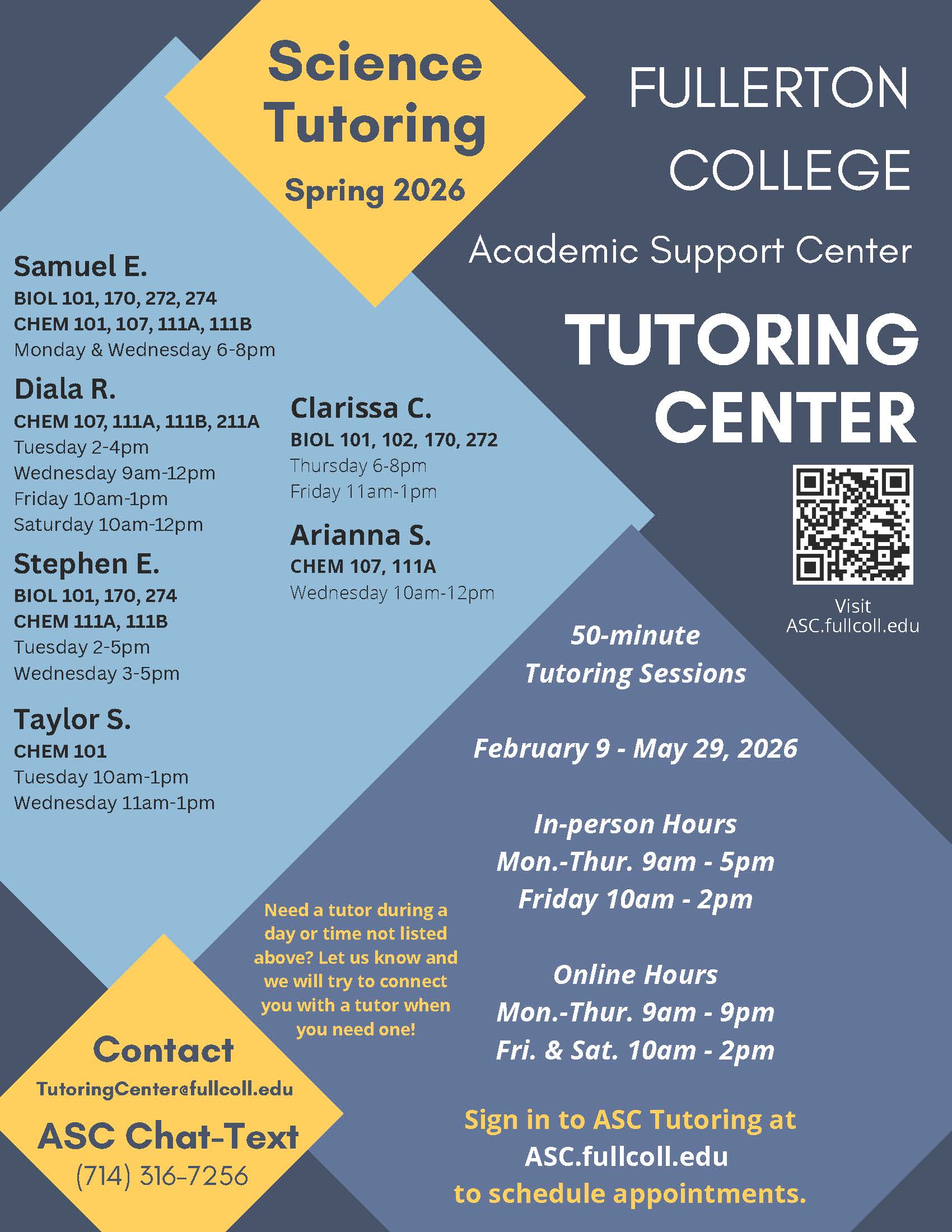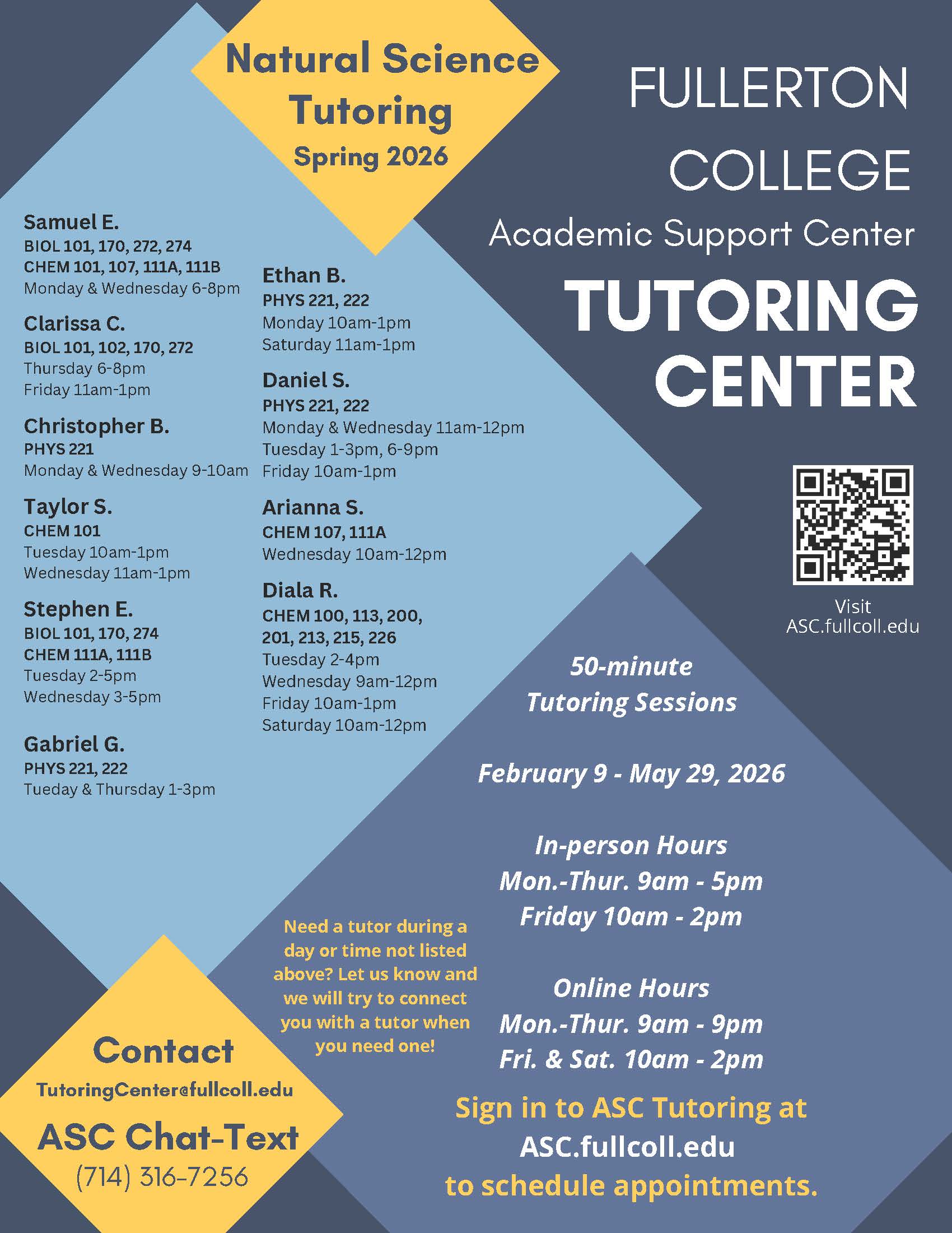 Academic Support Center ASC Hours ASC Staff Presentation Request Videos Jobs Contact Us Division Home Tutoring Center Tutoring Services Tutoring Flyers Cosmetology FAQ Writing Center Writing Center Services Online Writing Resources Writing Center Workshops FAQ English Department ESL Department Skills Center ESL Make-up Testing Workshops Math Success Program Hornets Tutoring Tutoring Center Flyers Check out the flyers for each subject here Spring 2026