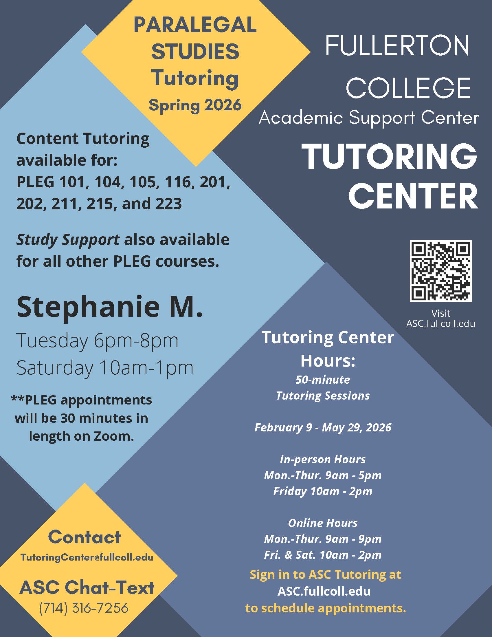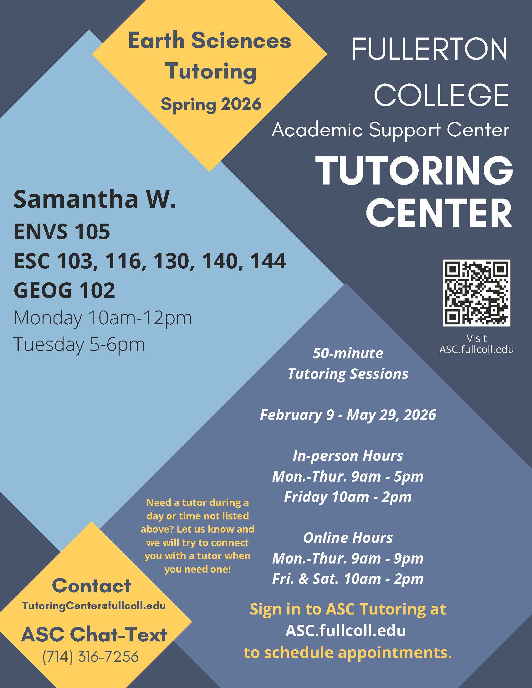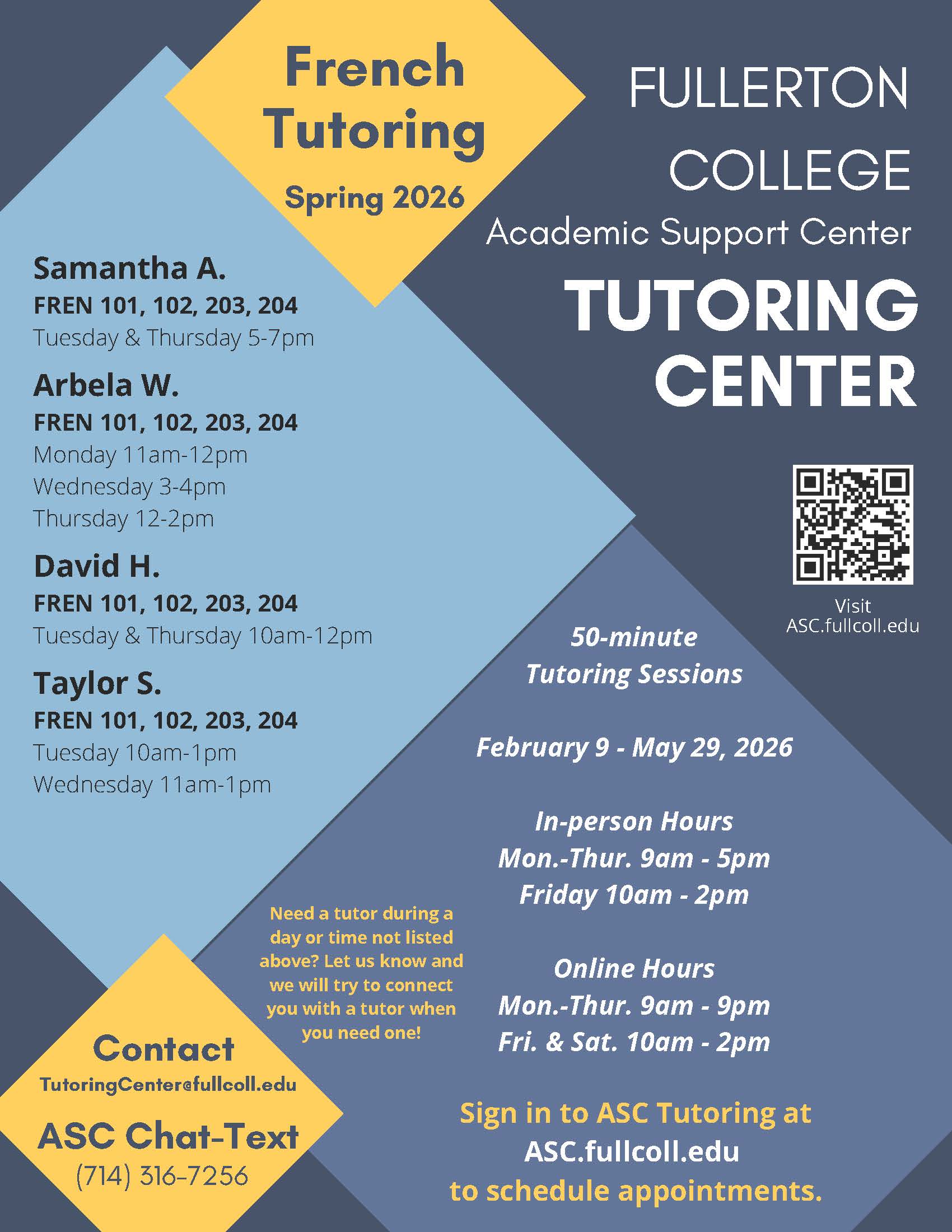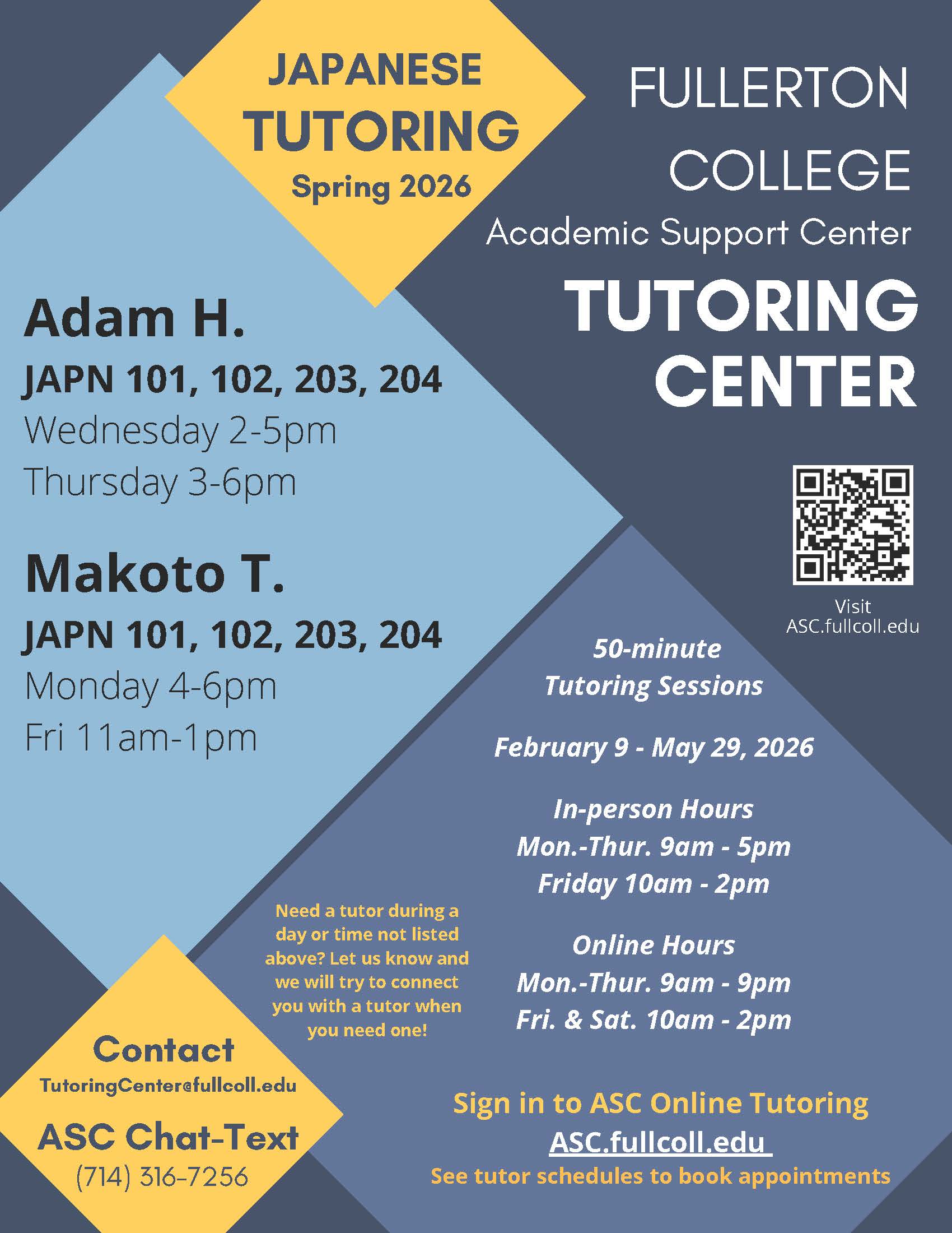 Academic Support Center ASC Hours ASC Staff Presentation Request Videos Jobs Contact Us Division Home Tutoring Center Tutoring Services Tutoring Flyers Cosmetology FAQ Writing Center Writing Center Services Online Writing Resources Writing Center Workshops FAQ English Department ESL Department Skills Center ESL Make-up Testing Workshops Math Success Program Hornets Tutoring Tutoring Center Flyers Check out the flyers for each subject here Spring 2026